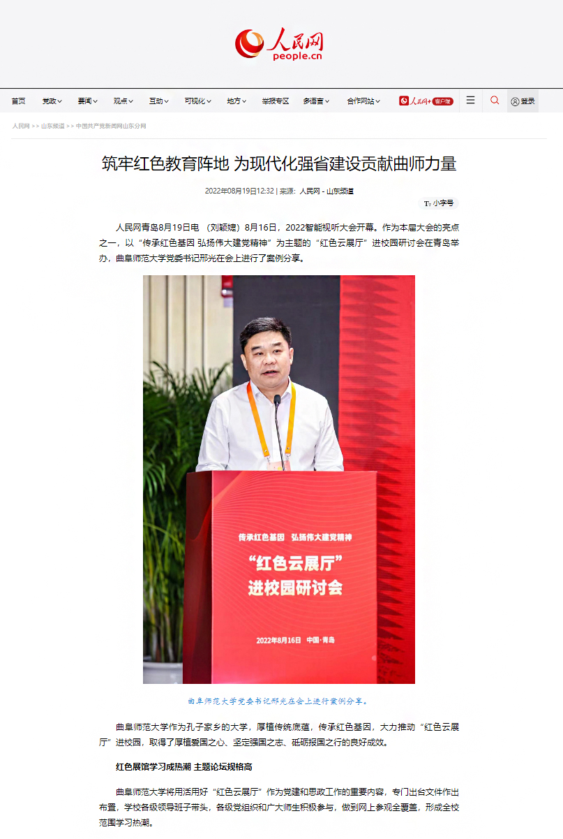 8月16日,由中央网信办、人民日报社、山东省人民政府指导,青岛市人民政府、山东省委网信办、人民网主办的2022智能视听大会开幕。作为本届大会的亮点之一,以“传承红色基因 弘扬伟大建党精神”为主题的“红色云展厅”进校园研讨会在青岛举办,人民网以《筑牢红色教育阵地 为现代化强省建设贡献曲师力量》《用活用好身边资源 让红色文化融进高校思政课》为题报道了米兰官方网站厚植传统底蕴、传承红色基因、推进立德树人的红色教育开展情况。
