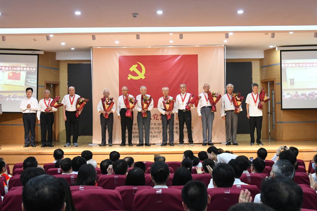 今年,党中央决定首次向符合条件的老党员同志颁发“光荣在党50年”纪念章,曲阜师大共有138名老党员获颁纪念章,他们当中党龄最长的为75年。学校领导为到场老党员代表一一颁发“光荣在党50年”纪念章,并献上鲜花,全场掌声雷动,在场师生深受鼓舞,大家纷纷表示要向老党员们学习,坚定理想信念,持守初心、永远奋斗!
