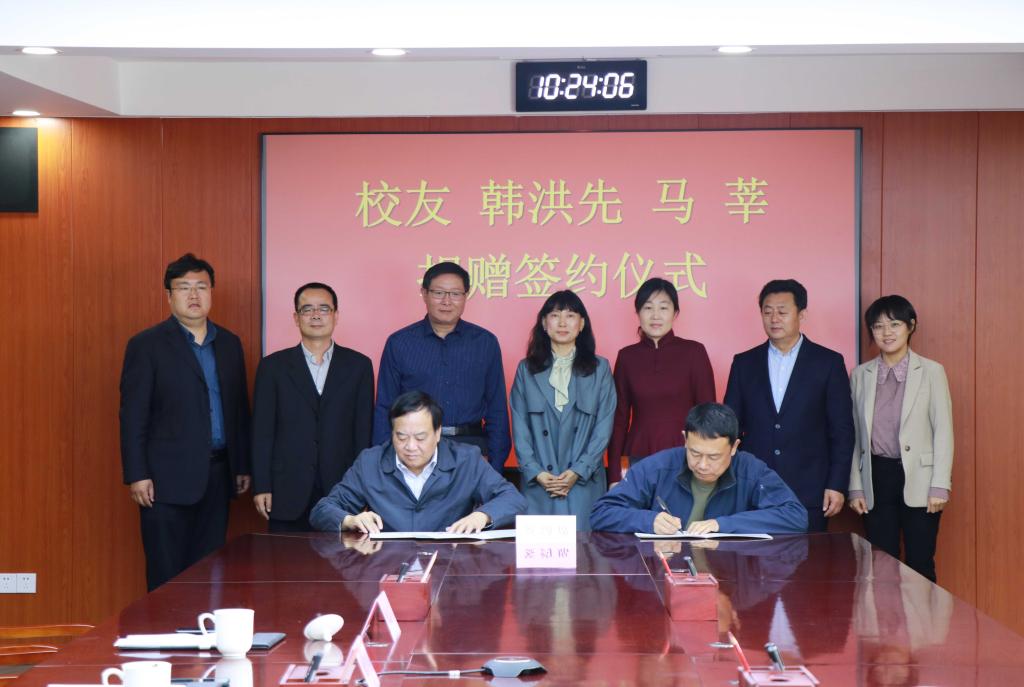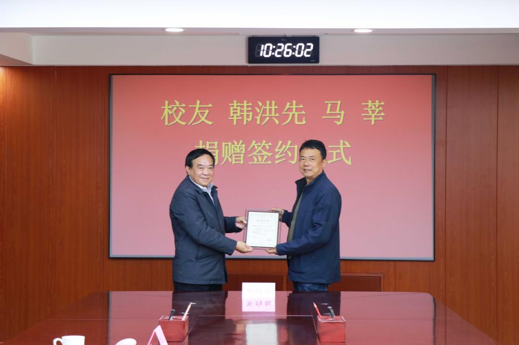 仪式上冯冲与韩洪先签订了100万元捐赠协议,并向韩洪先、马莘校友颁发捐赠证书。