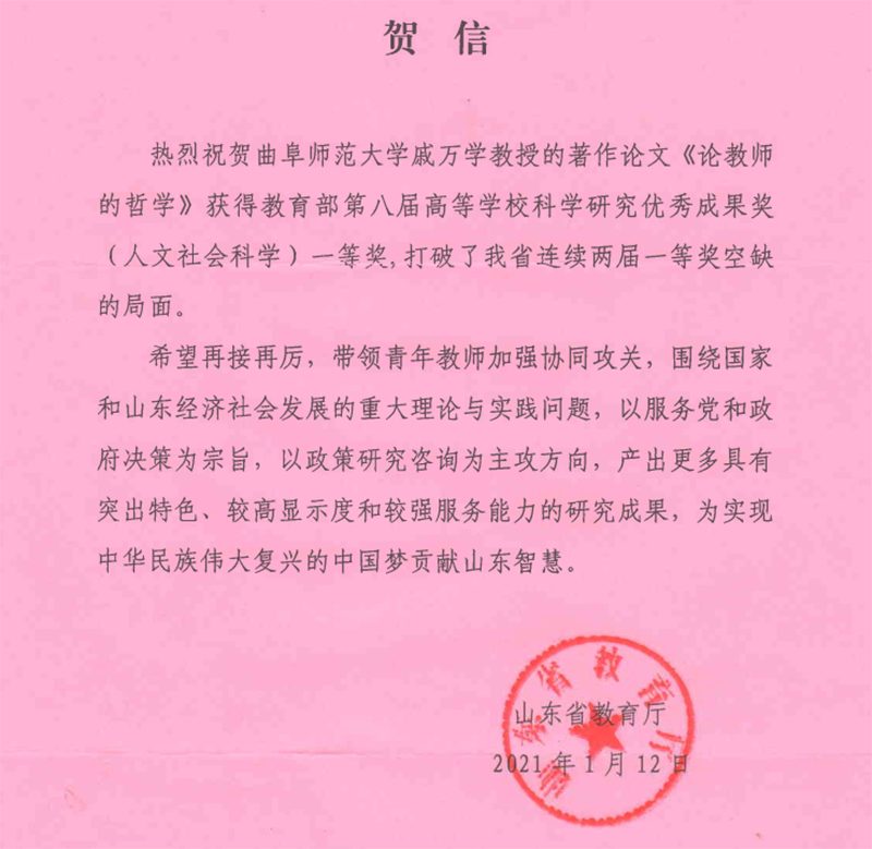 省教育厅向一等奖获得者戚万学教授发来贺信