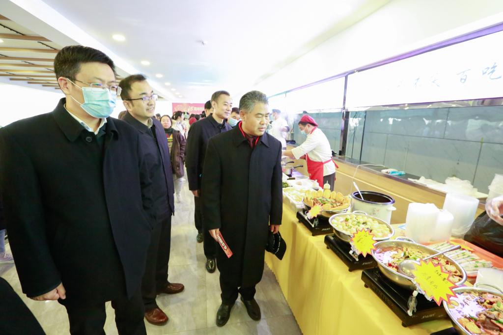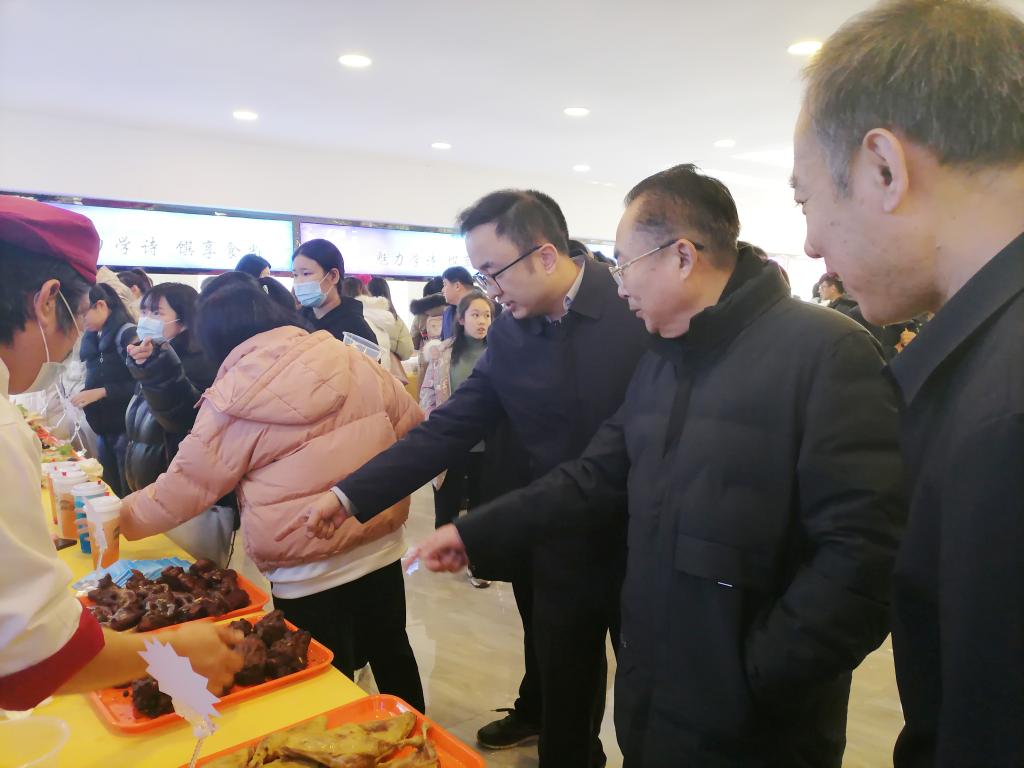 党委副书记扈庆学,纪委书记徐思生,副校长卢国强来到活动现场,与师生共同感受美食氛围。美食节饭菜受到广大师生的一致好评,走进餐厅,师生并肩接踵在各个美食摊前驻足。精美小炒、果蔬、水饺面食,还有来自后勤党委惠农村镇蔬菜基地的新鲜瓜果蔬菜一应俱全。