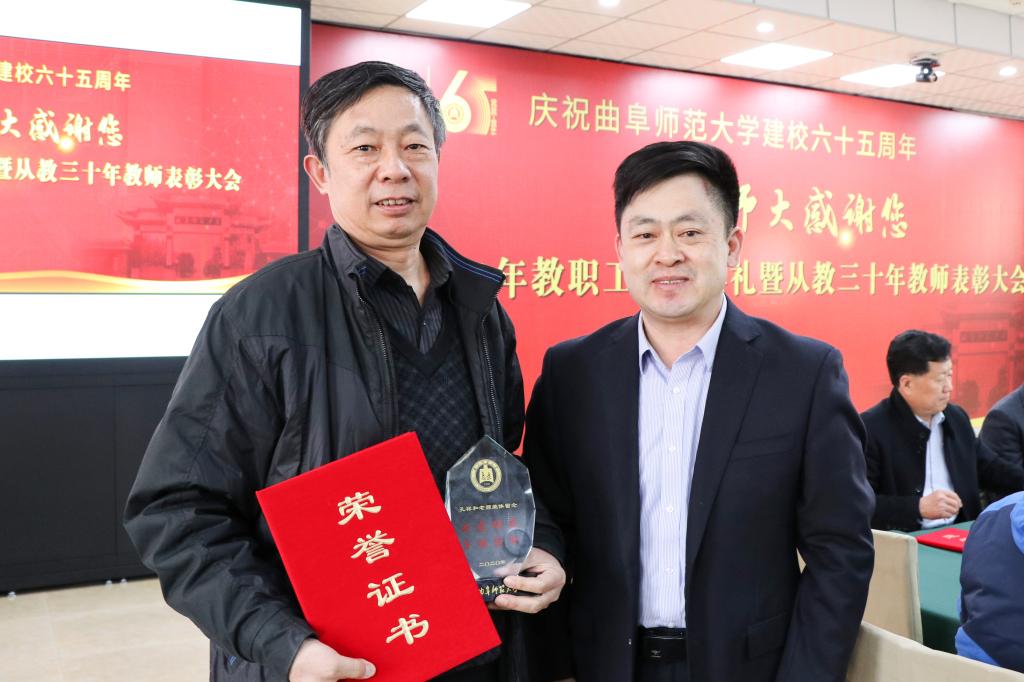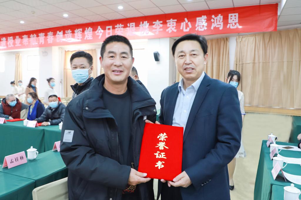 典礼上,戚万学、张洪海分别走到老教师身边,亲自为每位教师颁发荣誉证书和纪念牌,和大家一一握手言谢,送上最真诚的祝福和问候。
