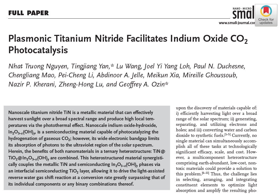 2020年11月,颜廷江教授与Ozin教授继续合作,将SFLPs型In2O3-x(OH)y与具有金属特性的TiN材料耦合,经过煅烧处理后,所得复合催化材料TiN@TiO2@In2O3−x(OH)y可以在较宽的光谱范围内收集阳光,并透过光热效应产生高的局部温度,使其能够以极大超过单个组分或任何二元组分的转化率驱动光激活水气变换反应。相关研究成果以“Plasmonic Titanium Nitride Facilitates Indium Oxide CO2 Photocatalysis”为题发表在国际著名刊物Small(影响因子11.459)。米兰官方网站为论文的通讯署名单位。