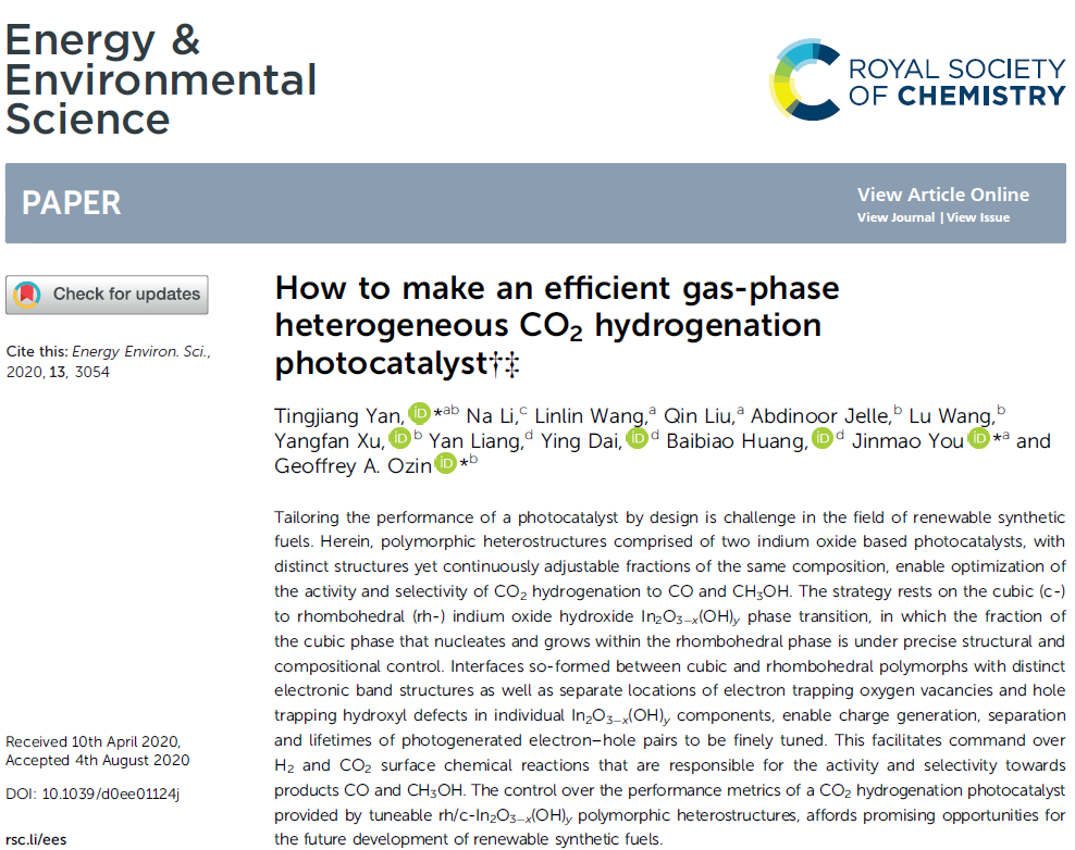 此外,2020年8月,颜廷江教授还基于立方相(cubic,c-)到菱形相(rhombohedral,rh-)氧化铟In2O3-x(OH)y的相变,通过调节rh/c-In2O3-x(OH)y多晶型异质结对CO2加氢光催化剂性能的指标,构建出了新型高效的缺陷异相结光催化剂,对未来可再生合成燃料的发展提供了良好的契机。相关工作发表以“How to Make an Efficient Gas-Phase Heterogeneous CO2 Hydrogenation Photocatalyst”为题发表在国际顶级期刊Energy & Environmental Science(影响因子30.289)。米兰官方网站为论文的第一署名单位和第一通讯署名单位。