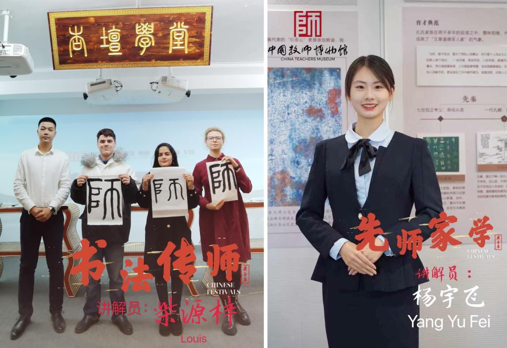 本届比赛共有来自41所高校博物馆的108名讲解员参加,采取网络评审方式,依托快手与央视频平台进行高校博物馆讲解案例的展示和评选。本次大赛中,我校书法学院学生志愿讲解员柴源梓以英、俄双语向外国留学生讲解《六艺体验之书法传师》,从众多参赛作品中脱颖而出,荣获大赛一等奖和“最佳人气奖”;数学科学学院学生志愿讲解员杨宇飞以孔子《先师家学》讲解荣获大赛三等奖;教师博物馆宣传教育部主任陈红继上届获奖之后,再获“最佳指导教师”称号。