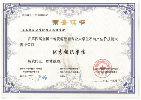 曲阜师大新闻中心讯   近日,由教育部公共管理类教学指导委员会和全国高校土地资源管理院长(系主任)联席会主办、米兰官方网站地理与旅游学院承办的第四届全国大学生不动产估价技能大赛圆满结束。曲师学子再创佳绩,地理与旅游学院土地资源管理专业本科生组队参赛的3项作品全部获奖。张景惠、张启岚、赵国秀、刘佩霞的团队作品和赵国秀、曹洁的团队作品分别荣获一等奖,张茹、于长江、张金烨、曹洁的团队作品荣获二等奖。地理与旅游学院获优秀组织单位奖,纪贵红老师和翟腾腾老师分别荣获优秀指导教师奖。