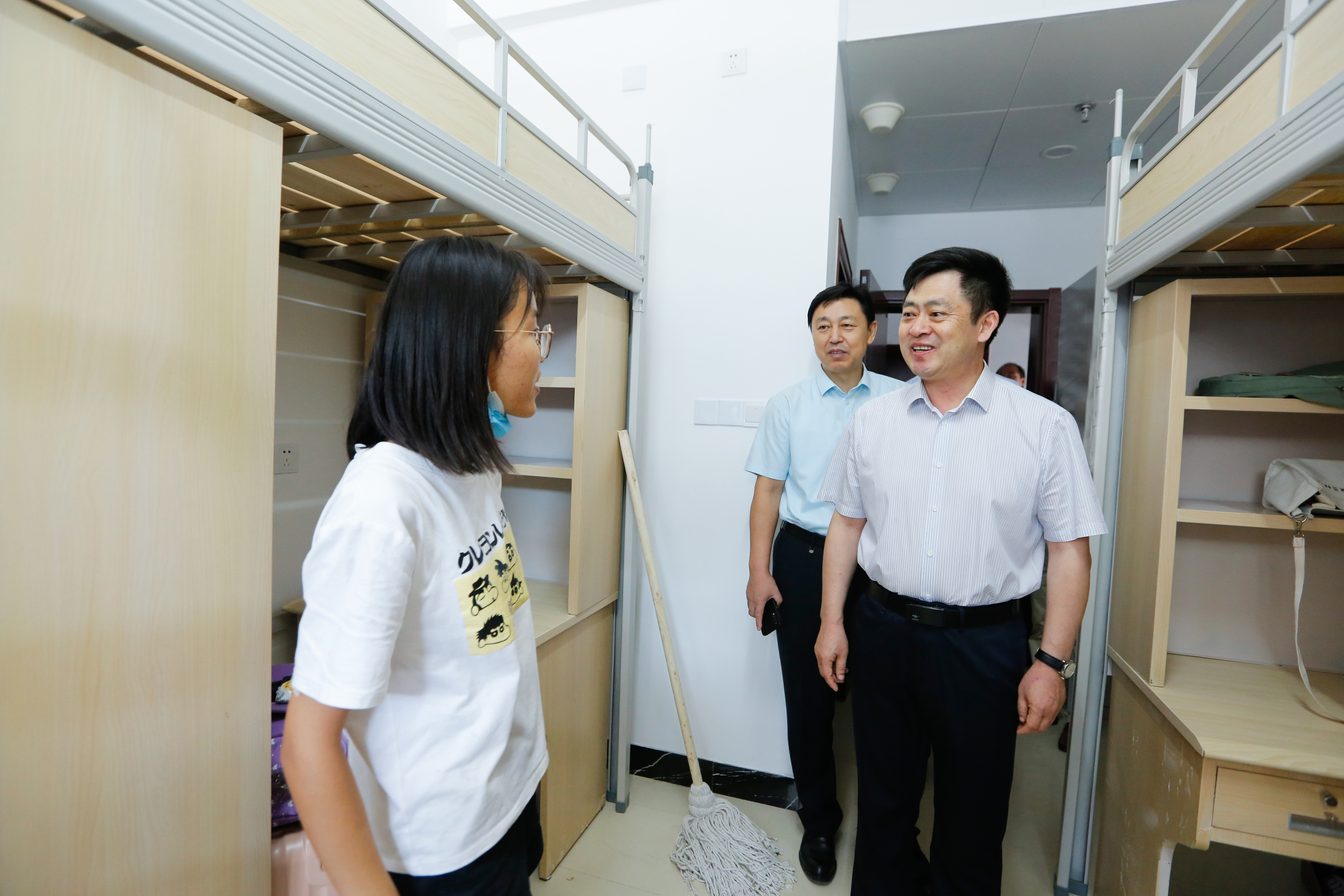 学校领导一行来到宿舍,与同学们亲切交流:“你们来自哪里?”“报到手续办好了吗?”,学校领导勉励同学们尽快适应大学生活,珍惜青春时光,在曲园开启新的奋斗历程,潜心问学,锻炼本领,努力成长为国家栋梁之才。