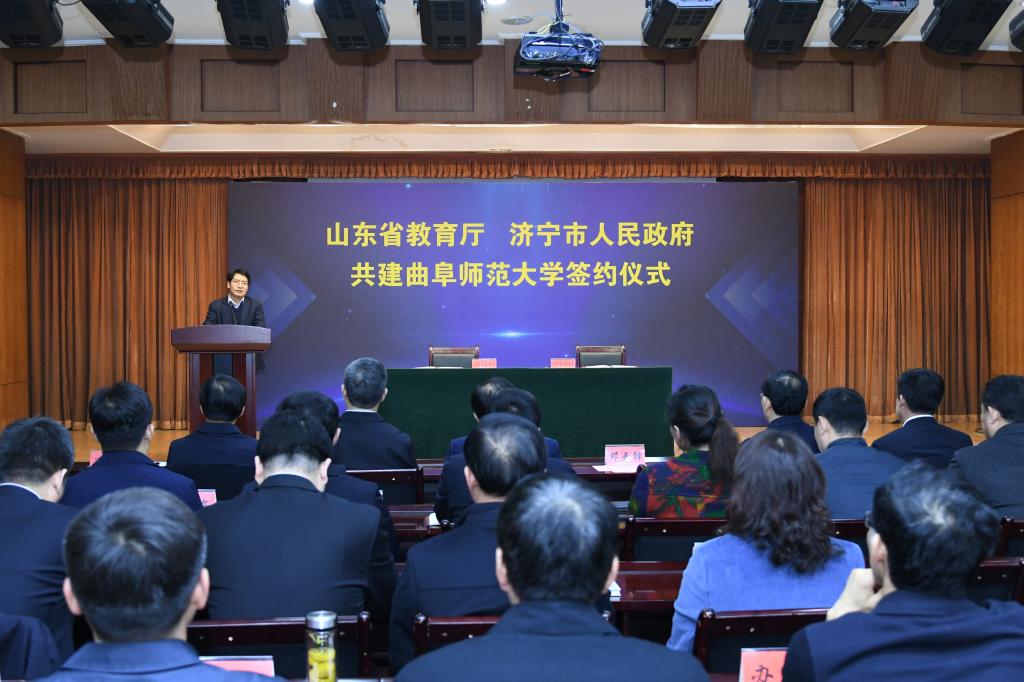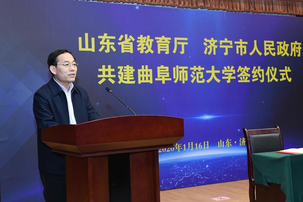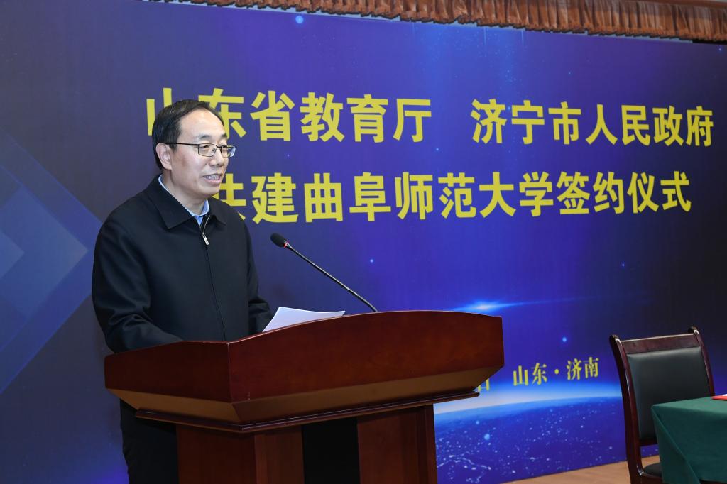 邓云锋在签约仪式上致辞,他指出,在新时代山东高等教育高质量发展的大好背景下,济宁市政府与省教育厅共建曲阜师大,对于实施教育强省、促进高等教育高质量发展将产生积极影响。近年来,济宁市坚定不移贯彻教育优先发展战略,全力打造鲁南经济带教育高地。曲阜师大事业发展跑出了令人瞩目的“曲师速度”,综合办学实力稳居省属高校第一方阵。市、校双方不断深化合作的深度和广度,已成为紧密的“命运共同体”。此次签署共建协议将进一步推动省、市、校三方携手并肩、共同发力,促进曲阜师大高质量发展,进而更加有力地支撑全省高等教育均衡发展,服务济宁经济社会发展。省教育厅将在一流学科、一流大学、一流专业、教学科研平台建设等方面给予学校重点支持;希望曲阜师大以省市共建为重要契机,增强发展信心,凝聚发展力量,领会共建精神,放大共建效应,对标国内同类一流高校,在赶超进位中实现新跨越;实施名校名城战略,为济宁乃至全省经济社会高质量发展作出新的更大贡献。