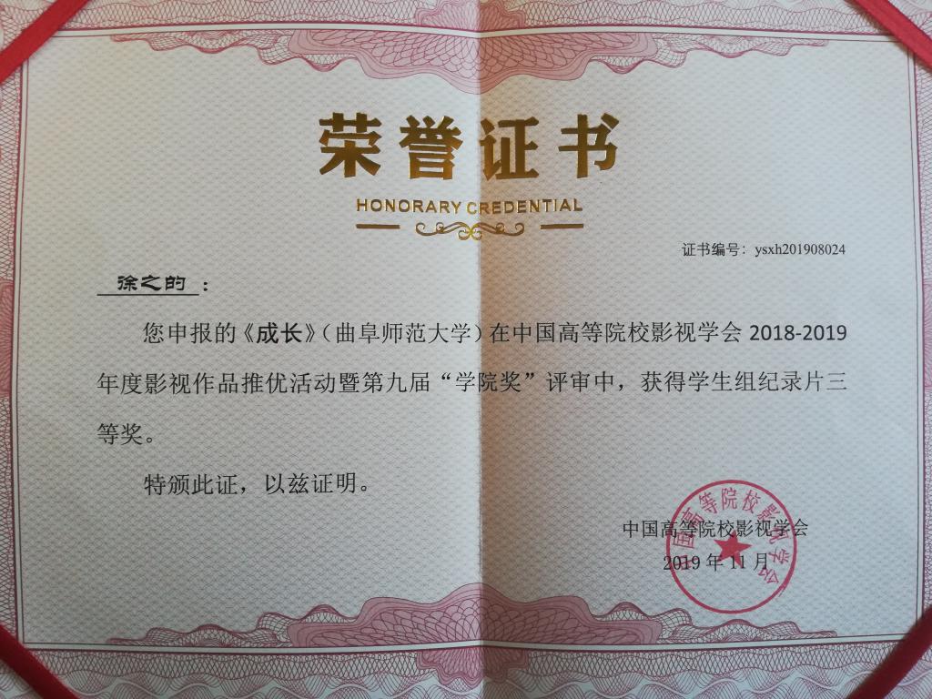 11月2日,中国高等院校影视学会第十九届年会颁奖典礼在济南举行。此次颁奖典礼颁发了第十二届“学会奖”、第九届“学院奖”、第四届“学人奖”。在张维刚老师的指导下,我校传媒学院2016级新闻学专业学生徐之的及其团队创作的纪录片《成长》荣获“学院奖”学生组三等奖。