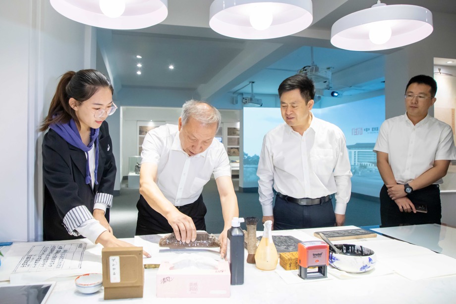 来到“教师鼻祖”展区,他逐一浏览了孔子教育思想单元的每一版块,并饶有兴致地体验了以习近平总书记赞扬教师语句制作而成的活字印刷,肯定这一互动体验方式为青少年学生喜闻乐见,在体验中潜移默化地达到教育目的。