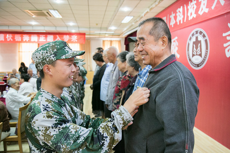 恳谈会上,58级老校友们依次走上讲台,由2018级新生为他们一一佩戴上校徽。岁月的沉淀和青春的朝气相得益彰,新生和老生紧握住彼此的手,这是跨越了六十年的情谊,这是曲园精神的传递。