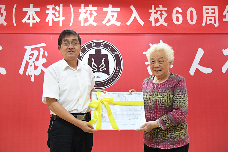 副校长王继锁来到校友们中间,代表学校对校友们的到来表示热烈欢迎,与校友们共同回顾了曲阜师大的发展历史与学校一个甲子的发展历程。他衷心感谢校友们对学校的关注支持,诚挚欢迎各位校友常回母校,分享那些珍藏的母校回忆。王继锁将58级校友的入学登记表重新颁发给24位与会校友。文学院院长夏静带来了学院的深切问候与关怀,并介绍了学院的学科建设和人才培养情况。