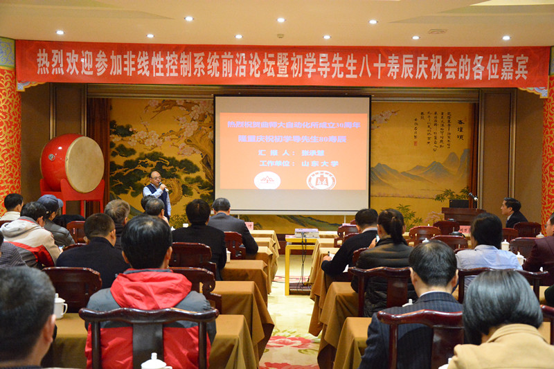 在学术报告阶段,长江学者、国家杰青、山东科技大学副校长周东华教授,长江学者、山东大学控制科学与工程学院院长张承慧教授,初老师的学生长江学者、国家杰青、南京理工大学自动化学院院长徐胜元教授,浙江工业大学博士生导师孙铭轩教授,烟台大学吴昭景教授,鲁东大学杨洪勇教授、李武全教授等作了专题学术报告。与会专家学者围绕新能源多能互补冷热电联动系统设计与优化、大数据驱动的高速列车信息控制系统故障诊断、时滞系统稳定性、时变系统迭代学习、随机拉格朗日系统跟踪控制、多自主体协同控制等国际前沿问题进行了广泛深入的交流。