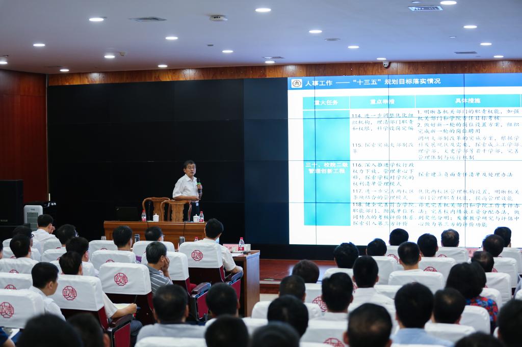 戚万学在报告中还就围绕实现党代会和“十三五”规划目标、提高干部执行力提出了具体要求。戚万学指出,根据党委部署,学校暑假期间开展了中层领导班子集中调整和干部选拔任用工作,整个过程平稳、顺利,队伍的年龄结构进一步优化,学历层次明显提升,人岗相适度不断提高。他强调,中层干部作为学校建设发展的中坚力量,其执行力如何、工作落实的成效如何,直接关系到学校发展目标能否实现,希望大家提振精神、对标前列、凝聚合力、善作善成。