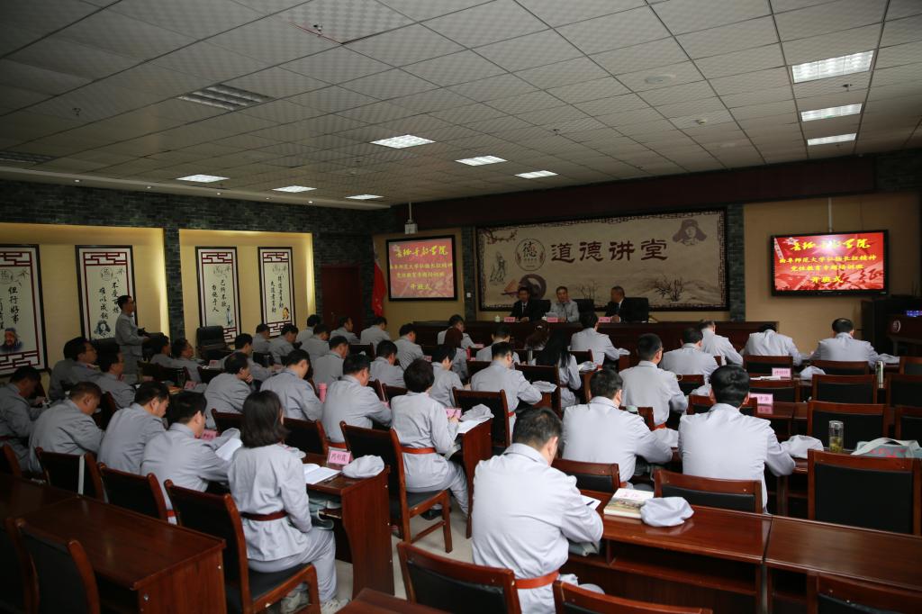 马东骅在开班仪式上致辞,他指出,学校第八次党代会提出了“不忘初心,再启征程,努力建设孔子家乡一流大学的奋斗目标”,要实现这个目标,迫切需要广大党员干部进一步弘扬和树立艰苦奋斗、迎难而上、百折不挠的无畏精神和英雄气概,激发锐意进取、攻坚克难、吃苦奉献、奋力攀登的创业激情。这次培训,就是大力倡导并积极践行长征精神,把奔向新目标的过程当作一次新的长征。他对参训人员提出要求:一是要珍惜学习机会,确保培训能取得扎实成效。全体参训人员要严格按照培训方案,潜心学习、专心思考、用心体验,感悟坚韧、乐观,敢于战胜一切艰难困苦的红军长征精神,切实把握长征精神实质,真正把长征精神内化于心,变成自己砥砺前行的精神动力。二是要严格遵守纪律,展现我校党员干部的良好形象,要认真贯彻落实中央“八项规定”精神,一切行动听指挥,共同营造风清气正的学习氛围,做到把长征精神带走,把好的形象留下。三是践行长征精神,激发开拓进取的不竭动力。要把践行长征精神贯穿到推进“两学一做”学习教育常态化制度化全过程,贯穿到履职尽责,推动学校事业发展的全过程,以实际行动弘扬长征精神,锤炼坚强党性,立足岗位实际,激发锐意进取、攻坚克难的斗志。马东骅代表学校向长征干部学院赠送了的书法作品。杜强向专题培训班授旗,并聘请我校研究生处处长李兆祥同志为客座教授。开班仪式结束后,全体人员聆听了红军长征在阿坝的专题报告。