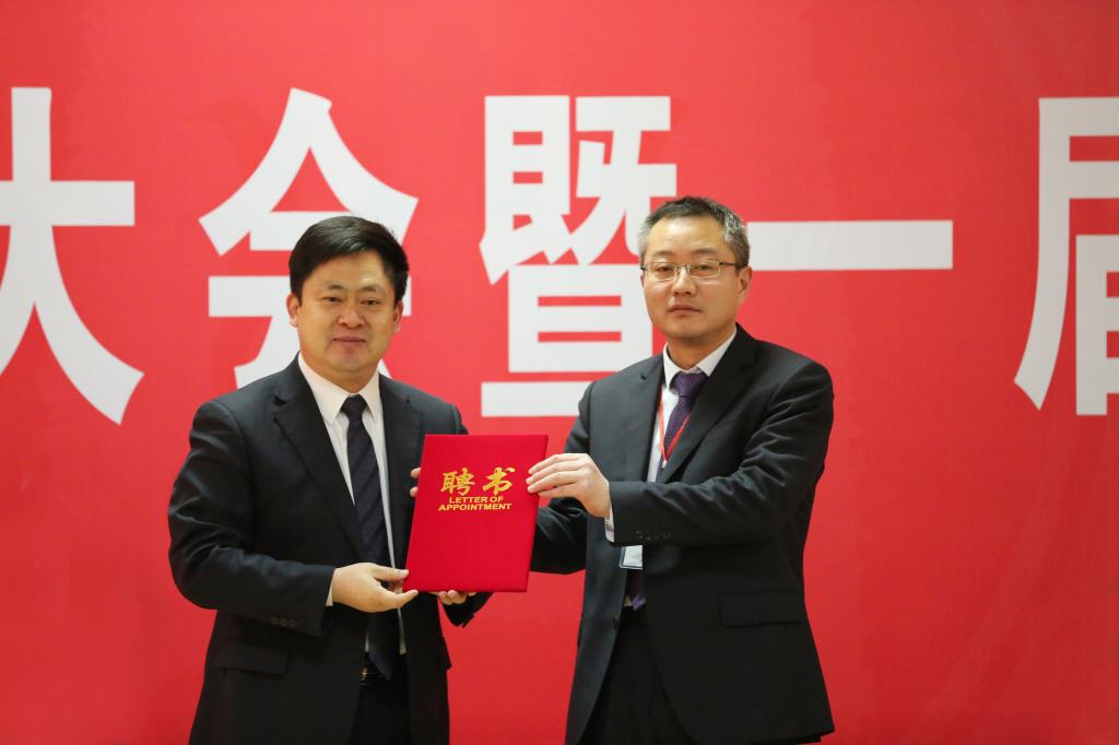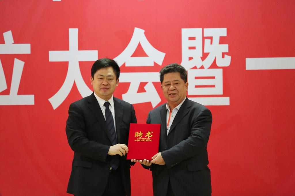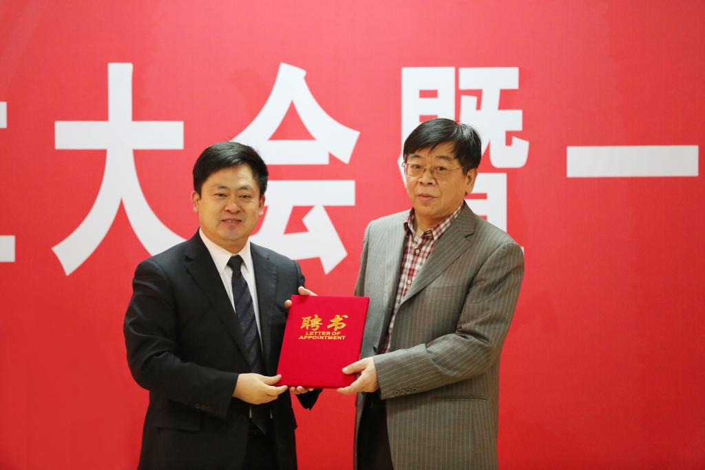 戚万学为学校第一届理事会副理事长、曲阜市人民政府市长彭照辉颁发聘书