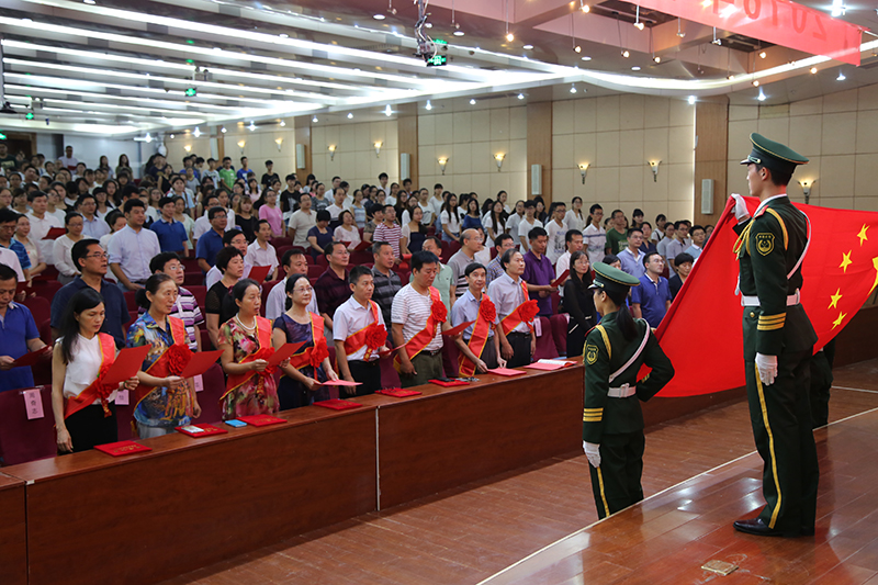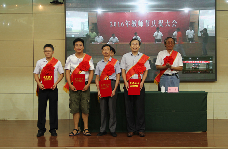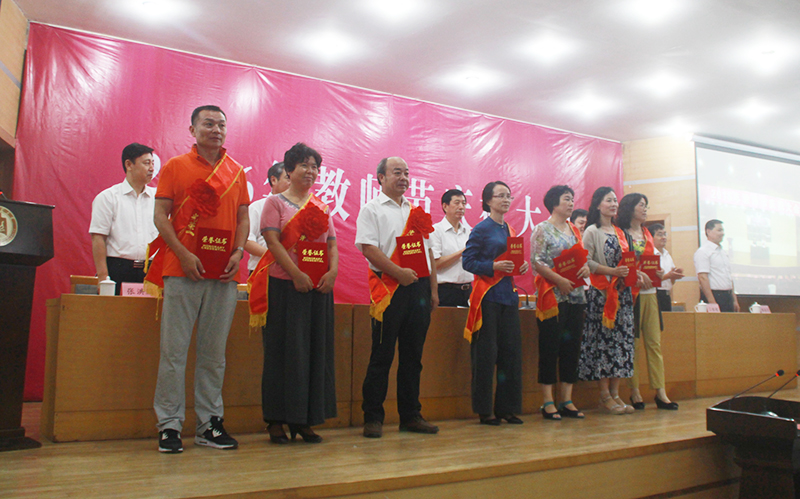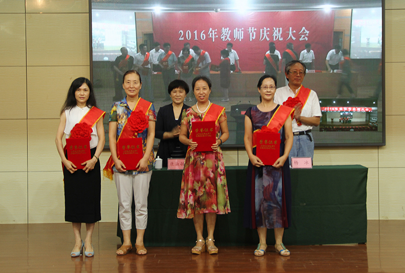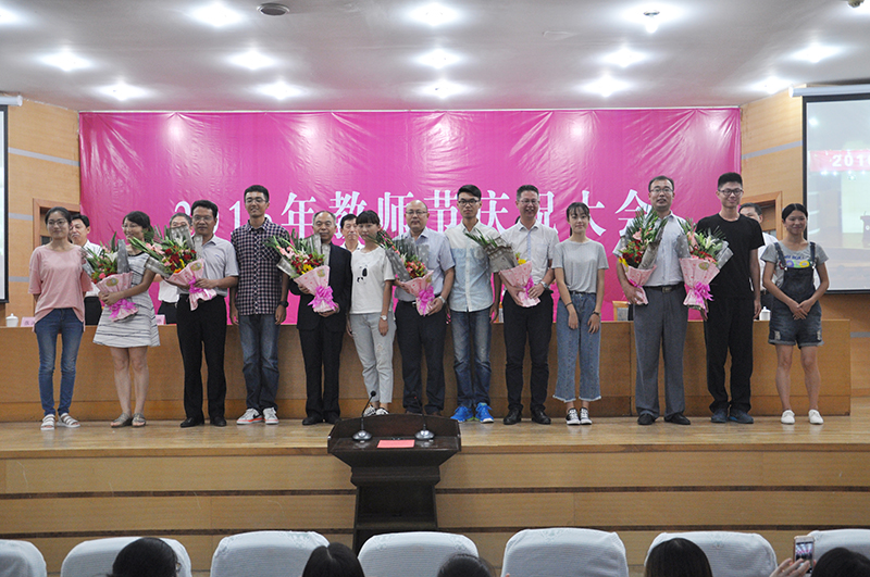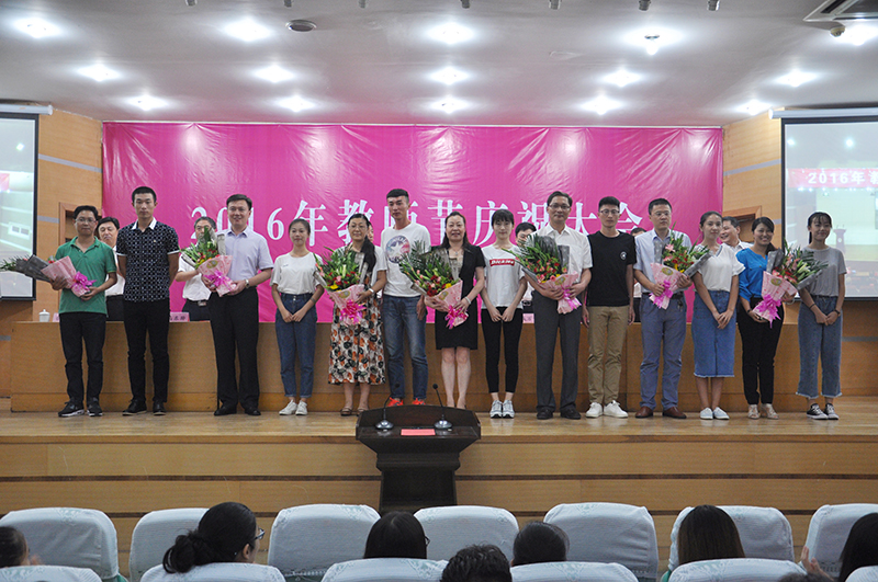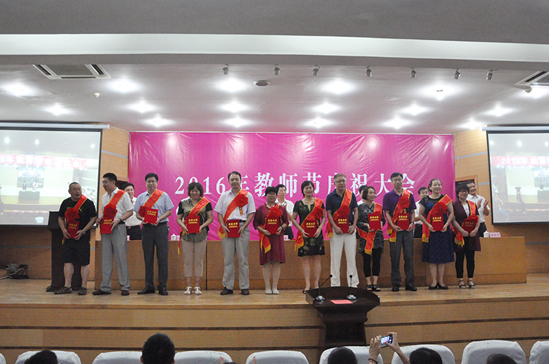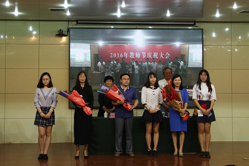副校长马东骅宣读了2015-2016学年获得省级以上奖励的教师名单和从教30周年教师名单。获得表彰的教师依次走上主席台,在主席台就坐的领导为从教30周年的教师颁发了荣誉证书,学生代表为老师们送上一束束盛开的鲜花,表达对老师们的崇高敬意与真挚祝福。教师代表、外国语学院秦洪武教授,新入职教师代表、信息科学与工程学院袁莎莎博士在大会上发言,表达了为学校事业发展贡献力量的决心与信念。