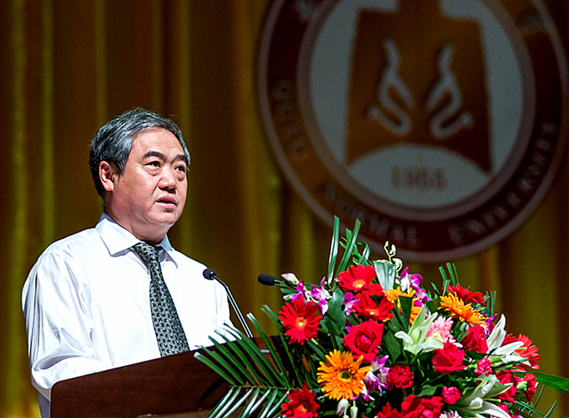 校长戚万学在典礼上致辞。戚万学代表学校向圆满完成学业的毕业生表示热烈祝贺,向为同学们的成长付出心血的老师、家长及社会各界表达最诚挚的谢意和敬意。面对即将扬帆起航的学子,他饱含深情地说:毕业了,你们有理由庆贺,因为四年来你们不断突破自己,终于破茧成蝶。大学的青春,将定格在这里;曲园的情怀,将牵起你们与这所大学一生相连,一直烙印和珍藏心间。戚万学说,六十余载砥砺耕耘,赢得万千芬芳,曲阜师大从未放弃对文化薪火相传的承诺,并以特有的品质与追求书写了孔子家乡兴教育人的“杏坛新篇”。曲园见证了同学们的努力与成长,同学们对曲园传统和精神的承当,终将使这所大学非同凡响。在新的一页即将翻开之际,戚万学以一名师者、长者的身份期盼同学们,做事时多点耐心,从容执着,因为坚持、坚守、从容较之折腾、闹腾、焦躁更要紧,更有意义;处世时守住良心,多点真诚,在变革的时代守护公义、懂得奉献绵薄、尊重他人、服务社会,不辜负自己、不辜负这个时代。戚万学最后寄语毕业生“世界很大、很精彩,背起行囊,送你出发。良心、耐心、责任、坚韧,将永远照亮你回家的路。累了,想了,静轩西路57号,等你回家!”