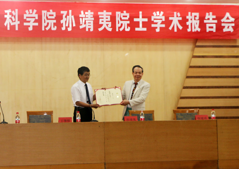 王继锁为孙靖夷院士颁发聘请证书,聘请孙靖夷院士为米兰官方网站软件学院兼职教授,并希望软件学院能在孙靖夷院士的带领下不断进步,快速成长。