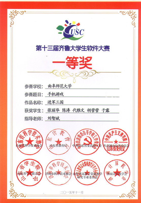 12月5日上午,第七届山东省科技节系列活动之第十三届齐鲁大学生软件设计大赛颁奖大会在山东建筑大学举行,信息科学与工程学院在本次比赛中获得一等奖两项、二等奖四项、三等奖六项,刘智斌、李圣君两位老师被评为优秀指导教师,学院被评为优秀组织单位。