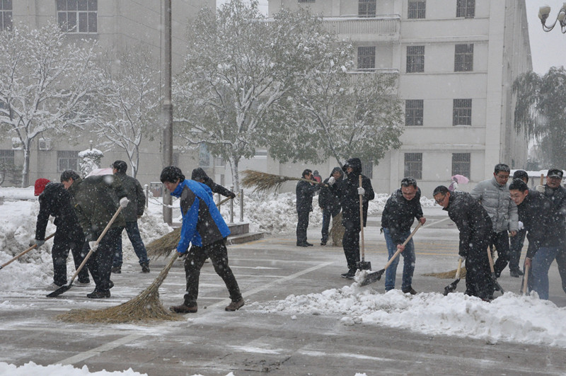 党委书记荆兆勋、校长戚万学等学校领导和师生一起,拿起清扫工具清理积雪。零下5度的低温,再度飘洒的雪花,加上凛冽的北风,增加了除雪的难度。师生们的手和脸都冻得通红,头发被雪水和汗水浸湿,但这丝毫没有影响大家的工作热情和效率。师生们团结协作,经过三个多小时的奋战,除雪工作取得了明显的效果。