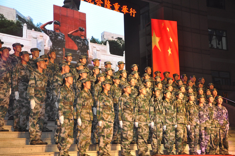 晚会采取台上文艺节目表演、台下新生军歌合唱穿插进行的形式,台上台下相互联动,所有2015级新生都既是观众、又是演员。军歌合唱由我校各学院共12支代表队参加,一支支红歌,一片片真情,《强军战歌》唱出了同学们的强军梦想以及献身强军实践的决心和壮志豪情,《走向复兴》的歌声充满希望,传达了同学们建设美好未来的理想和信念,《众人划桨开大船》铿锵有力,歌颂了齐心协力,团结互助的优良传统。2015级新生在接受了半个月的军训洗礼后,他们高昂的用军歌把热血的青春再度点燃,鼓声、乐声、朗诵声、呐喊声在聚光灯下交织出一篇华美乐章。今年正值抗战胜利七十周年和我校建校六十周年,这在夜空中回响的阵阵军歌是曲园学子对祖国,对母校最好的献礼。