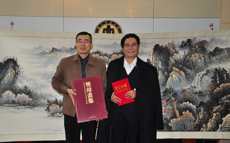 10月31日上午,知名画家樊璋先生受聘我校兼职教授,并向我校图书馆和美术学院捐赠了个人画集和绘画作品。美术学院院长李善阳向樊璋先生颁发了兼职教授聘书,图书馆副馆长王东波向樊璋先生颁发了作品收藏证书。