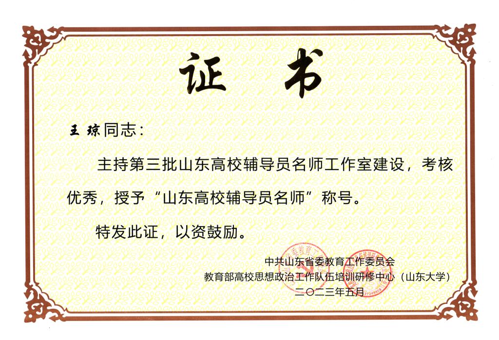 日前,山东省教育厅(中共山东省委教育工委)对山东省第三批高校辅导员名师工作室进行结项验收。经材料审核、述职答辩和专家评定,曲阜师大大一新生教育工作室获评优秀,工作室主持人、物理工程学院党委副书记王琼被授予“山东高校辅导员名师”荣誉称号。据悉,在11个第三批山东省高校辅导员名师工作室终期考核中,有6个工作室考核优秀。
