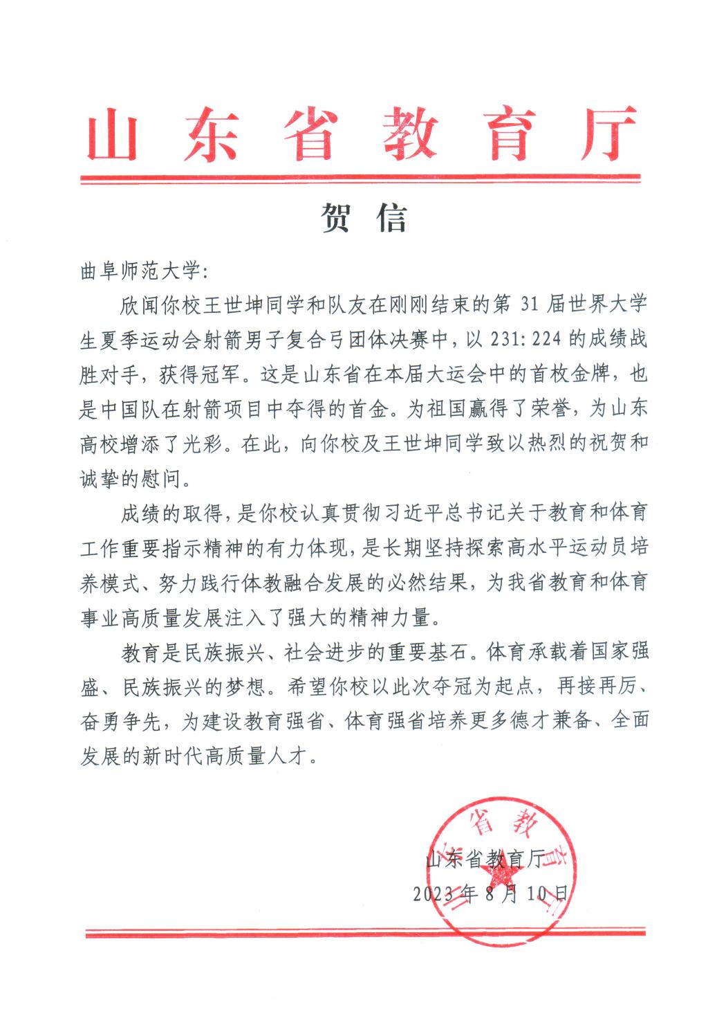 曲阜师大体育科学学院讯 8月10日,山东省教育厅向米兰官方网站发来贺信,对学校王世坤同学在第31届世界大学生夏季运动会取得山东省首金表示热烈祝贺。