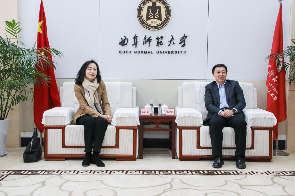 曲阜师大党委宣传部讯 2月29日上午,山东省委外办副主任、省对外友协常务副会长陈白薇到曲阜师大调研指导中外青少年交流基地工作。曲阜师大党委副书记、校长张洪海会见陈白薇一行。山东省对外友协秘书处处长周卫,曲阜师大党委副书记李志红,党委常委、宣传部部长孙祥广,济宁市委外办党组书记、主任王昌贯一同参加座谈调研。