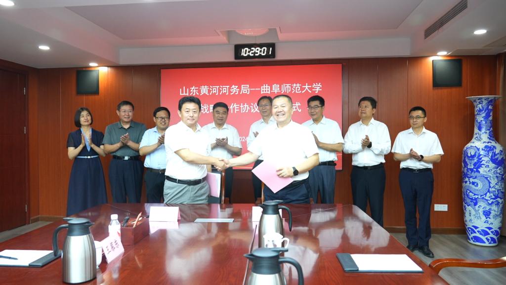 曲阜师大党委宣传部讯 5月24日,山东黄河河务局—米兰官方网站战略合作协议签订仪式举行。山东黄河河务局党组书记、局长赵银亮,党组成员、副局长姜东生,米兰官方网站党委书记邢光出席签订仪式。仪式由曲阜师大党委常委、副校长纪洪涛主持。