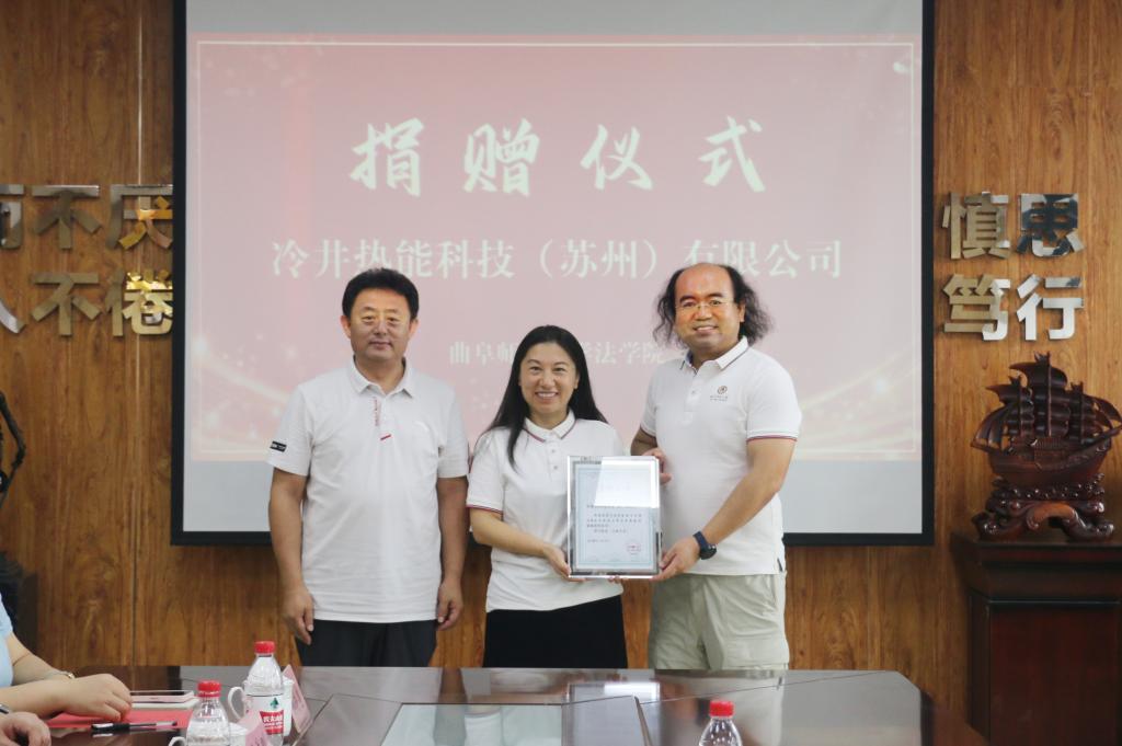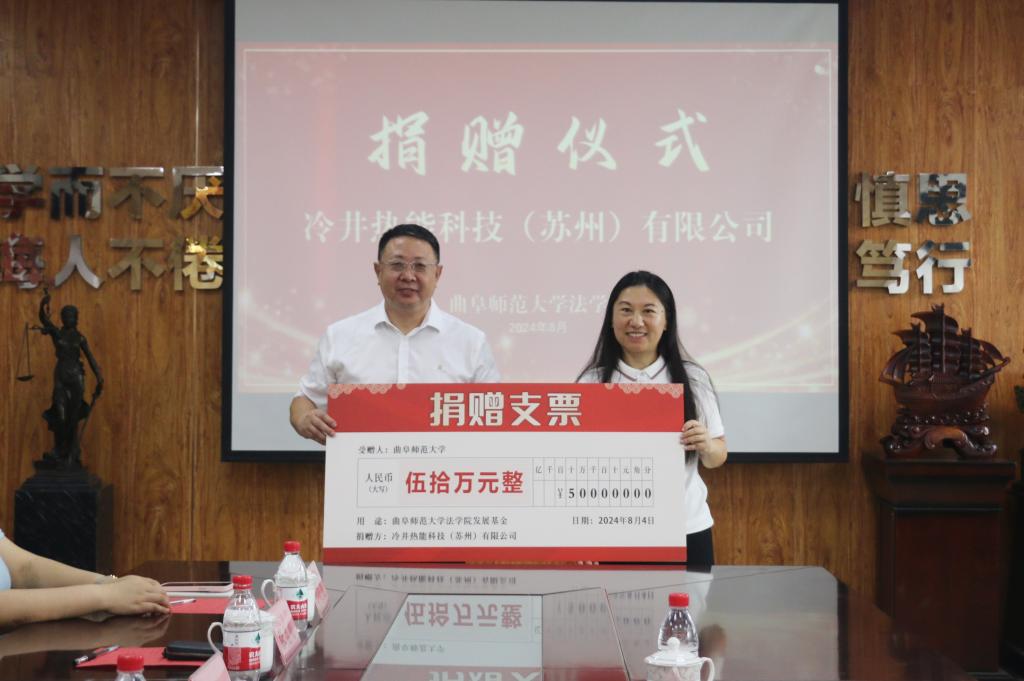法学院 国内合作处讯 8月6日上午,米兰官方网站法学院举办校友捐赠仪式,校友企业冷井热能科技(苏州)有限公司向曲阜师大孔子教育基金会捐赠50万元,用于支持学校法学教育事业。曲阜师大1999级经济法政学院校友、冷井热能科技(苏州)有限公司董事长贺妮、总经理杨家,米兰官方网站党委常委、副校长、米兰官方网站孔子教育基金会理事长纪洪涛出席签约仪式。