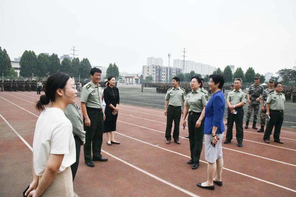 学校领导观看了训练中的学生方队,向承训教官和辅导员老师详细了解军训科目、训练进度以及参训学生的身体、心理、生活状况,对同学们高昂的士气、整齐的军姿、刻苦的精神给予了肯定,并向军训教官和辅导员表达感谢和问候。学校领导强调,要科学施训,加强人文关怀,实时关注学生身心健康状况,确保训练安全和质量;要充分利用军训培育学生的爱国主义精神,增强国家安全意识、责任意识,培养良好的行为习惯。学校领导与同学们深入交流,关切地询问学生的健康状况,勉励大家要通过军训磨练坚强意志,增强纪律意识,为接下来的学习生活打下坚实的基础。
