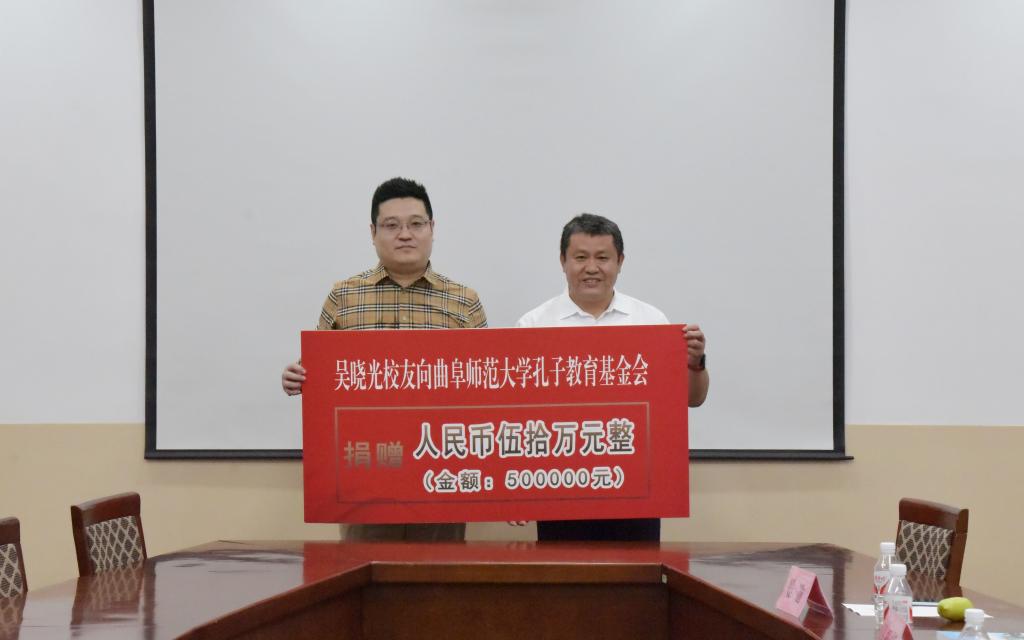 曲阜师大国内合作处讯 9月28日下午,吴晓光校友捐赠签约仪式在曲阜师大举行。曲阜师大体育科学学院2012届毕业生、深圳市恒拓仪表有限公司董事长、深圳市云龙教育基金会副理事长吴晓光,曲阜师大党委常委、副校长、孔子教育基金会理事长纪洪涛出席仪式。
