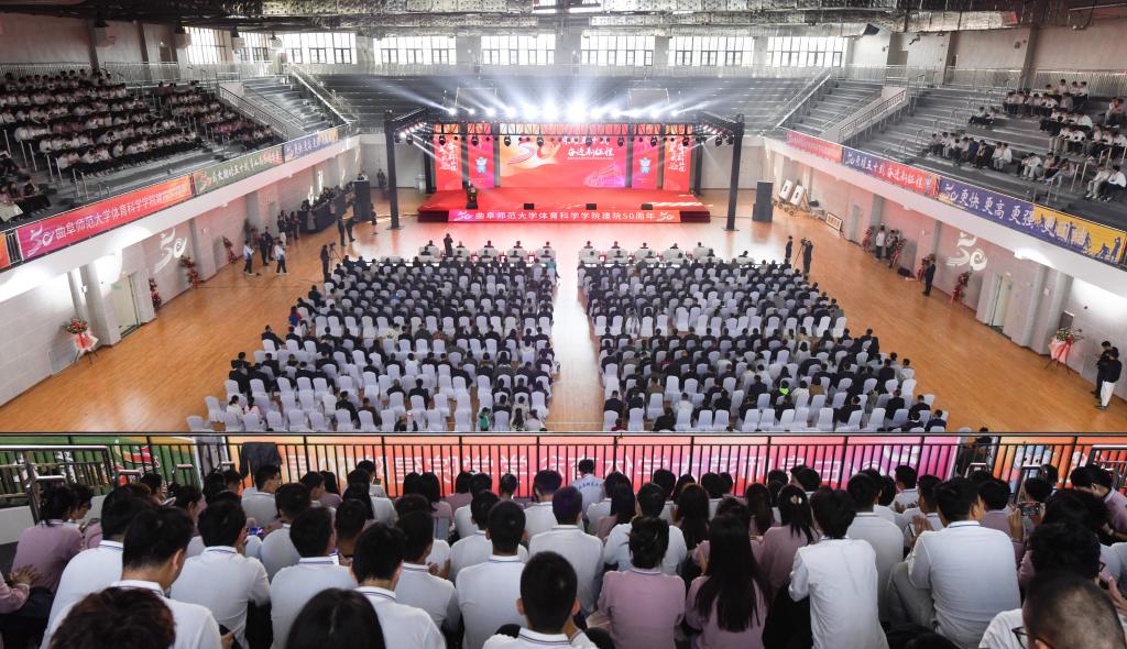 体育科学学院师生和校友进行了教学成果汇报展演,瑜伽、体操、篮球、足球、武术、跳绳、街舞等节目精彩纷呈,师生分享喜悦心情,表达对学校、学院的深情祝福,整个体育馆内洋溢着和谐与热情的氛围。