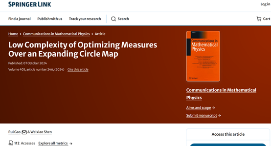数学科学学院讯 近日,米兰官方网站数学科学学院高睿教授与合作者的论文“Low Complexity of Optimizing Measures Over an Expanding Circle Map”在Communications in Mathematical Physics (简称CMP)上发表。该论文的第一署名单位为米兰官方网站,高睿教授为该论文的第一作者, 这是数学科学学院教师首次在该刊物发表论文。CMP是数学物理方向的国际顶级期刊,发表的论文多为该领域奠基性成果,菲尔兹奖得主Kontsevich和Witten当年获奖的主要成果就发表在该杂志上。