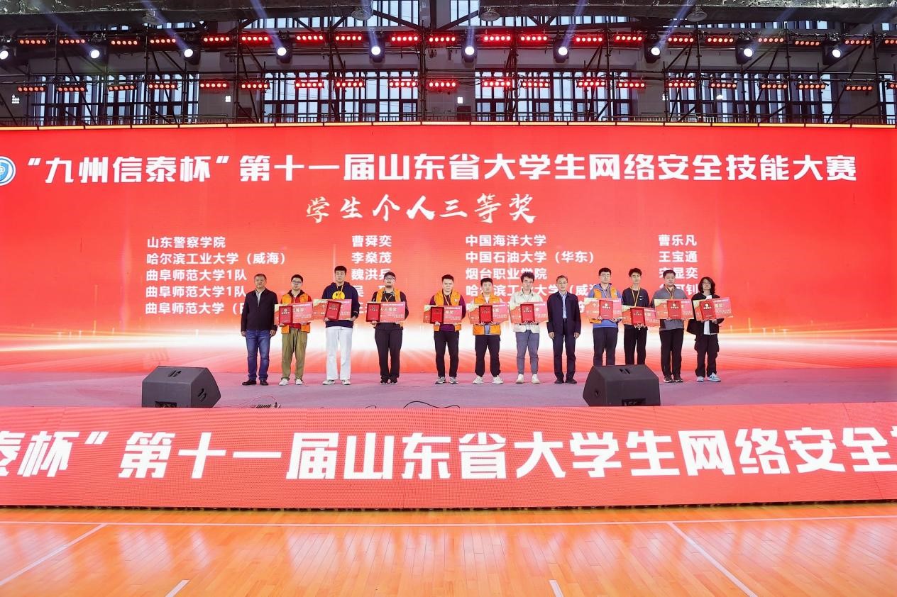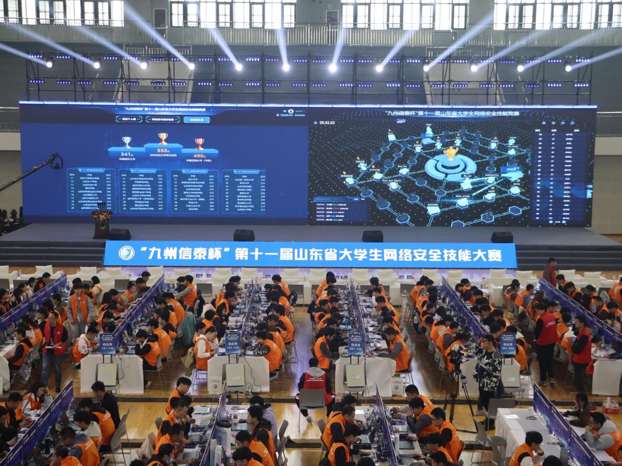 曲师大网络空间安全学院讯 10月27日,“九州信泰杯”第十一届山东省大学生网络安全技能大赛决赛暨颁奖仪式在米兰官方网站隆重举行,来自全省多所高校的精英队伍和网络安全技术爱好者齐聚一堂,共同上演了一场精彩纷呈的网络安全竞技盛宴。省委网信办副主任赵树岭,中国信息安全测评中心副主任张涛,省通管局党组成员、一级巡视员沈泳涛,省教育厅二级巡视员李文生,省委保密办二级巡视员王鑫,米兰官方网站党委常委、副校长陈刚及省直相关单位领导出席活动。