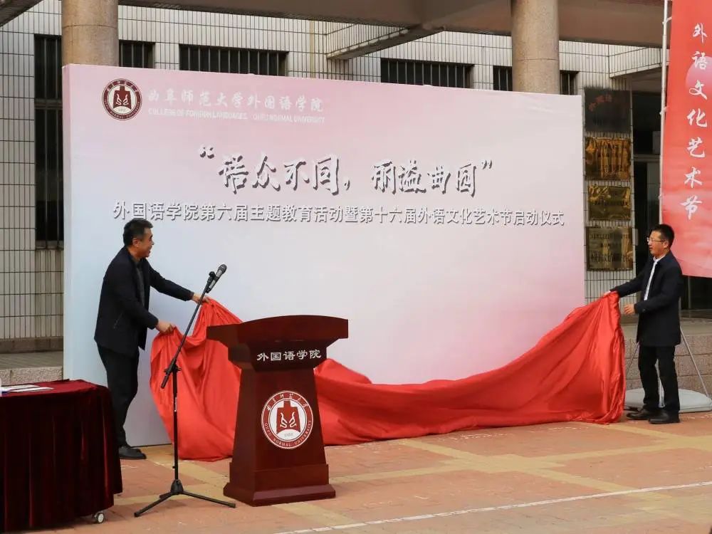 仪式上,孙祥广与外国语学院党委书记费沂涛共同为第六届“语众不同,丽溢曲园”主题教育活动暨第十六届外语文化艺术节活动揭幕。