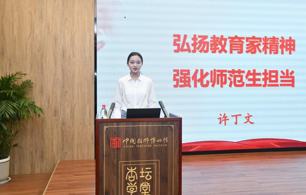 宣讲团成员文学院本科生许丁文围绕教育家精神的时代背景和核心要义,以《弘扬教育家精神,强化师范生担当》为题,采取微课宣讲展示的方式,讲述了支月英、张桂梅两位老师的感人事迹,并结合自身的学习感悟,与现场师生共同分享了师范生在新时代背景下的责任与担当。