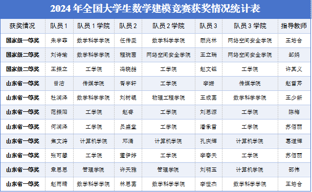 曲阜师大数学科学学院讯 近日,由教育部高等教育司和中国工业与应用数学学会联合主办的2024年全国大学生数学建模竞赛获奖名单公布,曲阜师大在激烈的竞争中脱颖而出,斩获国家一等奖1项、二等奖2项,山东省一等奖8项、二等奖20项、三等奖30项,国家级奖项获奖数量在省属本科院校中名列前茅,取得了本项赛事参赛历史上的最佳成绩。