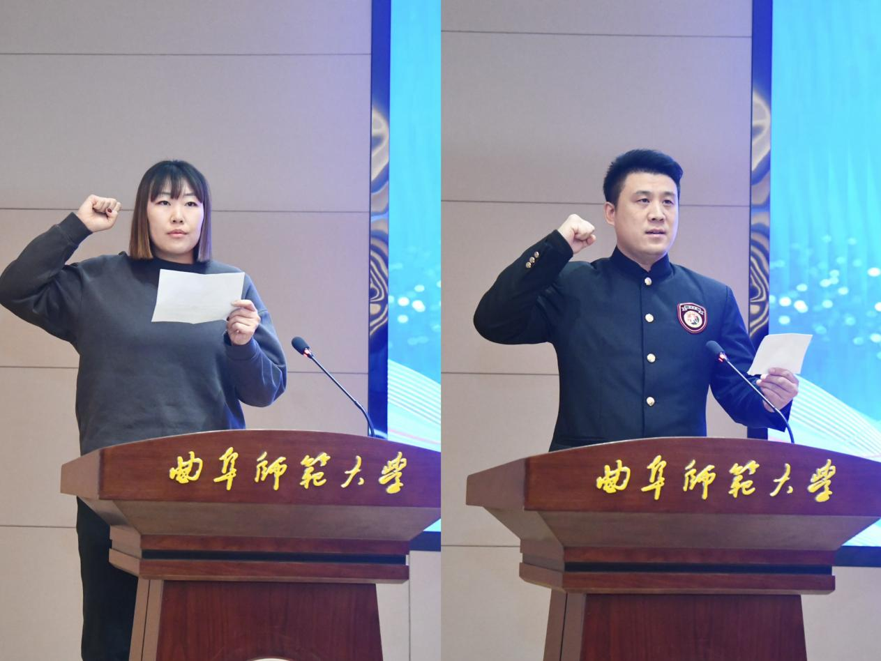 开幕式由体育学部主任兼体育科学学院院长、公共体育教学部主任姜付高主持。烟台工程职业技术学院教师周榕代表全体参赛教师宣誓;米兰官方网站体育科学学院武术教研室主任、山东省第五届高校体育教师基本功大赛武术项目总裁判长樊腾飞代表全体裁判员宣誓。
