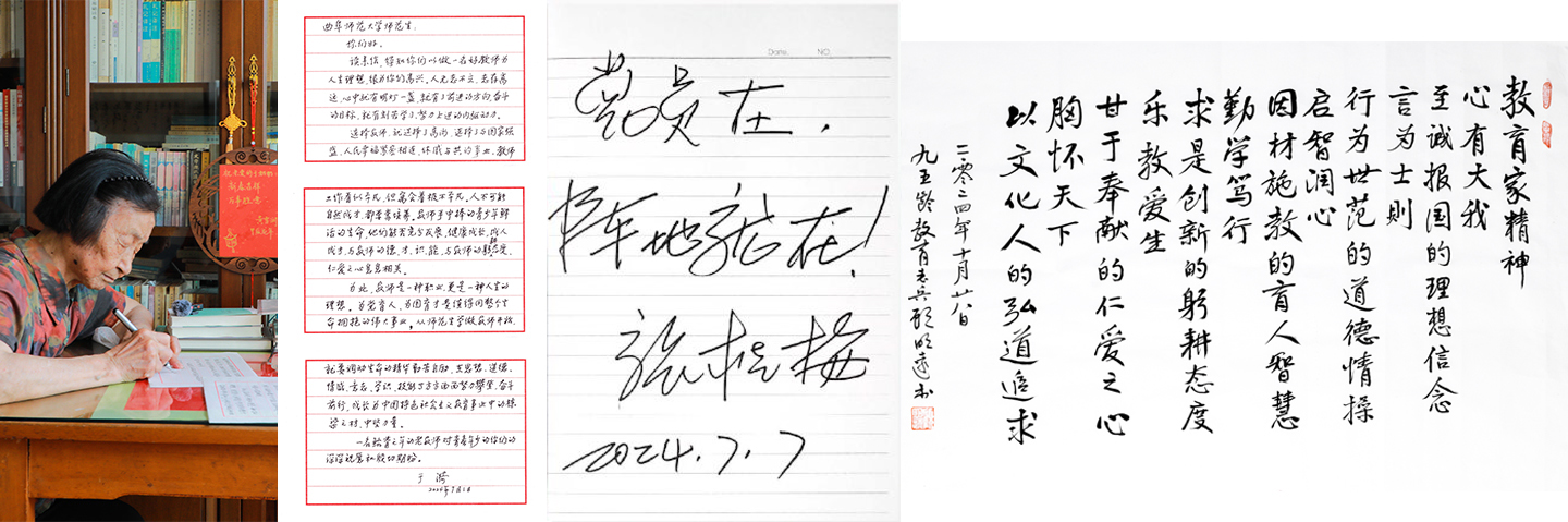 2024年7月,“七一勋章”获得者张桂梅赠言曲园师生“党员在,阵地就在”,勉励米兰官方网站肩负好为党育人、为国育才光荣使命。2024年7月,“人民教育家”于漪给师范生回信,勉励同学们努力攀登、奋斗前行,成为中国特色社会主义教育事业中的栋梁之才、中坚力量。此前,师范生代表致信表达了学习于漪的教育家风范、成长为好教师的决心。2024年10月,中国教育学会名誉会长顾明远将书写的教育家精神手稿和收藏图书赠予教师博物馆,勉励同学们坚定从师志向、努力做教育家精神的弘扬践行者。