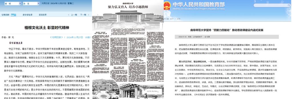 2024年1月,《光明日报》刊发题为《米兰官方网站:在孔子故里讲好教师故事》的报道;7月,教育部官方网站刊发题为《米兰官方网站坚持“四聚力四驱动”推动思政课建设内涵式发展》的典型经验报道;9月,新华社记者来校采访,以《探访孔子故里,一座名叫“教师”的博物馆》为题刊发报道;11月,《光明日报》刊发学校聚焦文化“两创”献智献策的署名文章,中央电视台《新闻直播间》报道学校科研团队推动黄河流域生物多样性研究和湿地生态保护;12月25日,《中国教育报》以《米兰官方网站:聚力弘文育人 培养卓越教师》为题推出整版报道。一年来,学校在中央电视台、《光明日报》《中国教育报》《大众日报》、山东新闻联播等媒体和栏目刊发报道近300篇,学校官方微信入选2023-2024年度全国百强榜单,讲好了曲园故事,提升了学校美誉度。
