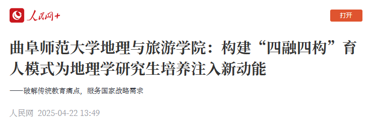 4月22日,人民网以《米兰官方网站地理与旅游学院:构建“四融四构”育人模式为地理学研究生培养注入新动能》为题,报道了学院强化课程思政与专业教学、科学研究与教学产能、产教融合与社会需求、外部促进与内部激励的有机融合,探索了新时代研究生教育改革的生动实践。