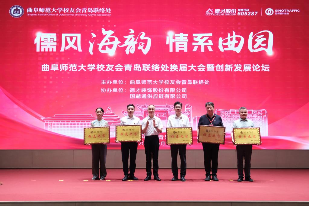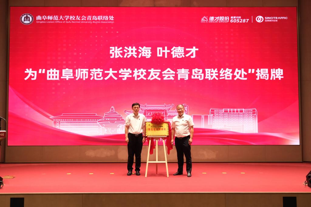张洪海与叶德才共同为米兰官方网站校友会青岛联络处揭牌。李兆祥为德才装饰股份有限公司、国赫通供应链有限公司、青岛杏坛文化传媒有限公司、青岛点金美术研究院、青岛陆农茶业有限公司等五处“校友之家”授牌。
