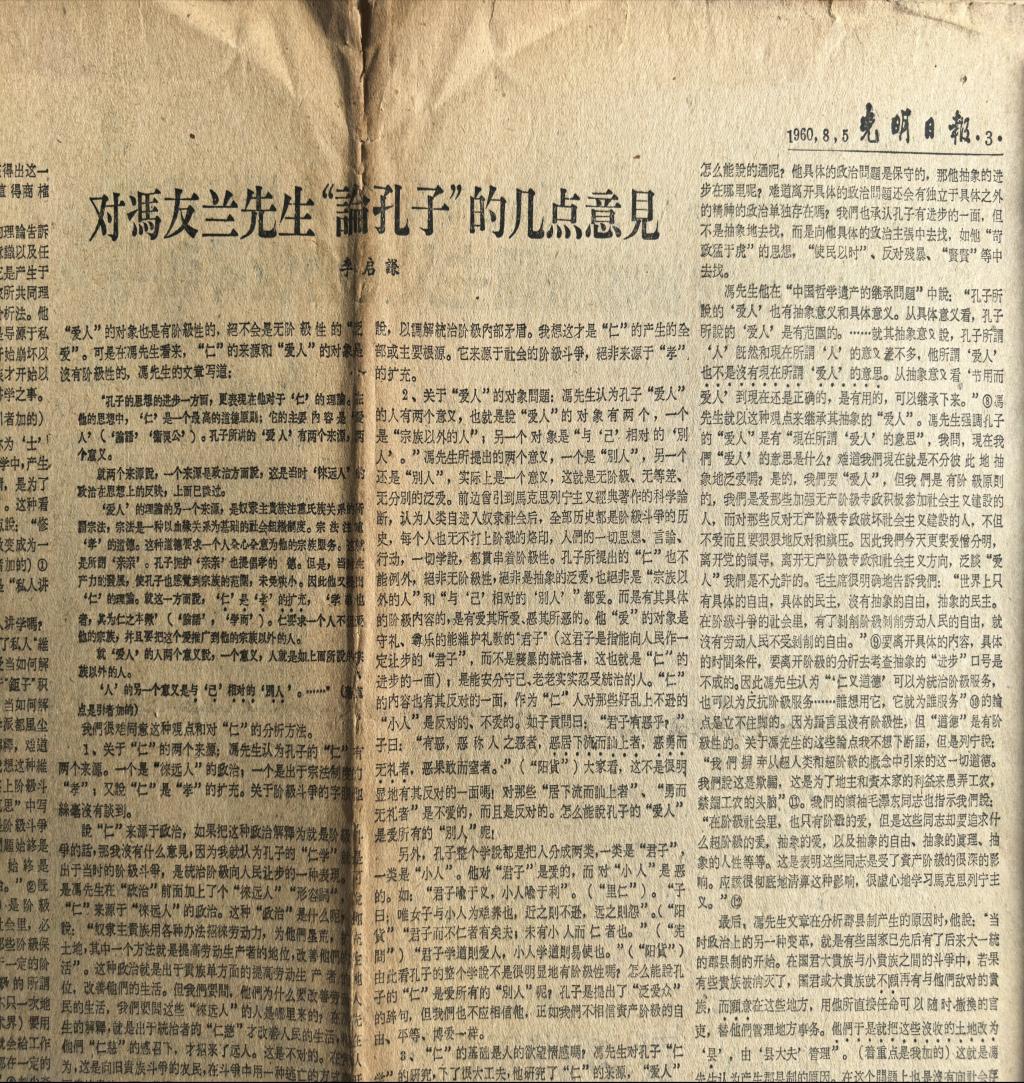 爷爷的“顶天”,是对学问至高境界的孜孜以求和对真理的不懈探寻。这种精神的内涵,包含着不盲从权威的锐气。早在1960年,尚是青年学者的他便在《光明日报》上发表了《对冯友兰先生‘论孔子’的几点意见》,敢于对学界泰斗冯友兰先生的观点发表不同意见,这种不囿于成说、勇于求真的胆识,是他“顶天”风骨的初露锋芒。这份胆识,继而沉淀为他那近乎苛求的严谨与专注。童年记忆中,他书桌上一本本批注得密密麻麻的笔记,曾是我眼中的“神秘地图”。如今抚摸着泛黄的纸页,我明白这“顶天”,是竹节般一节节的踏实积累,是书页间永不疲倦的求索。
