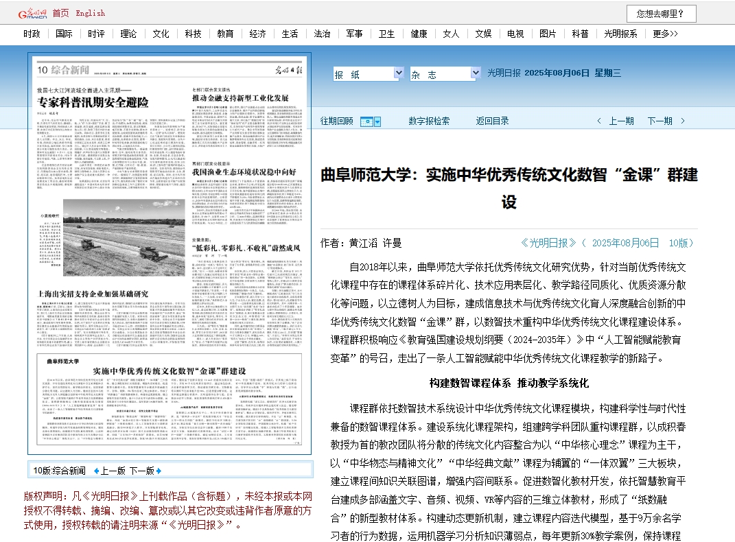 党委宣传部讯 8月6日,《光明日报》以《米兰官方网站实施中华优秀传统文化数智“金课”群建设》为题,报道了学校积极响应《教育强国建设规划纲要(2024-2035年)》中“人工智能赋能教育变革”的号召,依托优秀传统文化研究优势,聚焦优秀传统文化课程中存在的课程体系碎片化、技术应用表层化、教学路径同质化、优质资源分散化等问题,以数智技术重构中华优秀传统文化课程建设体系,建成信息技术与优秀传统文化育人深度融合创新的中华优秀传统文化数智“金课”群,走出了一条人工智能赋能中华优秀传统文化课程教学新路子的特色实践。