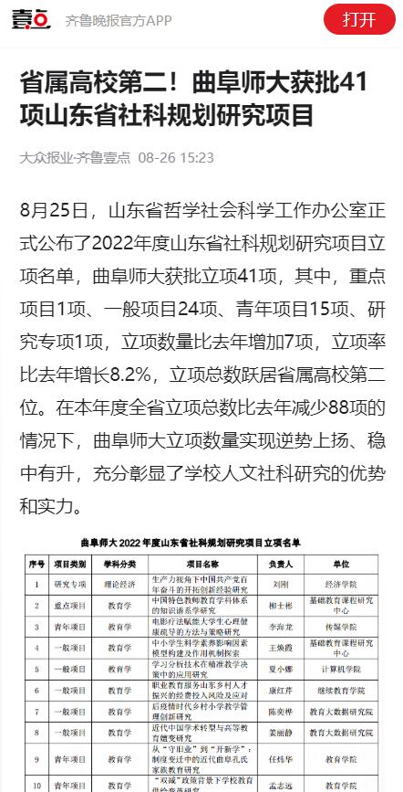 【齐鲁壹点】省属高校第二!曲阜师大获批41项山东省社科规划研究项目