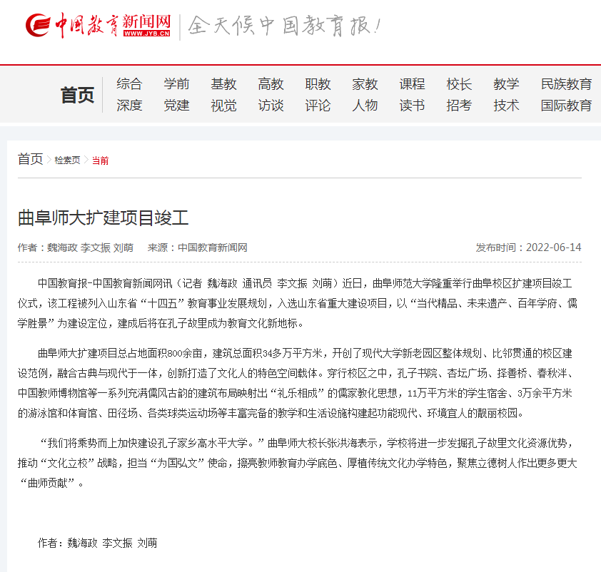 【中国教育新闻网】曲阜师大扩建项目竣工