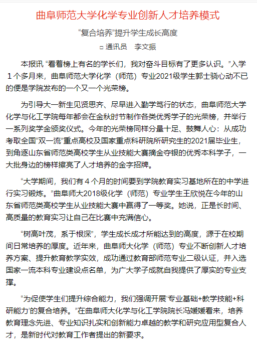 【山东教育报】米兰官方网站化学专业创新人才培养模式—— “复合培养”提升学生成长高度